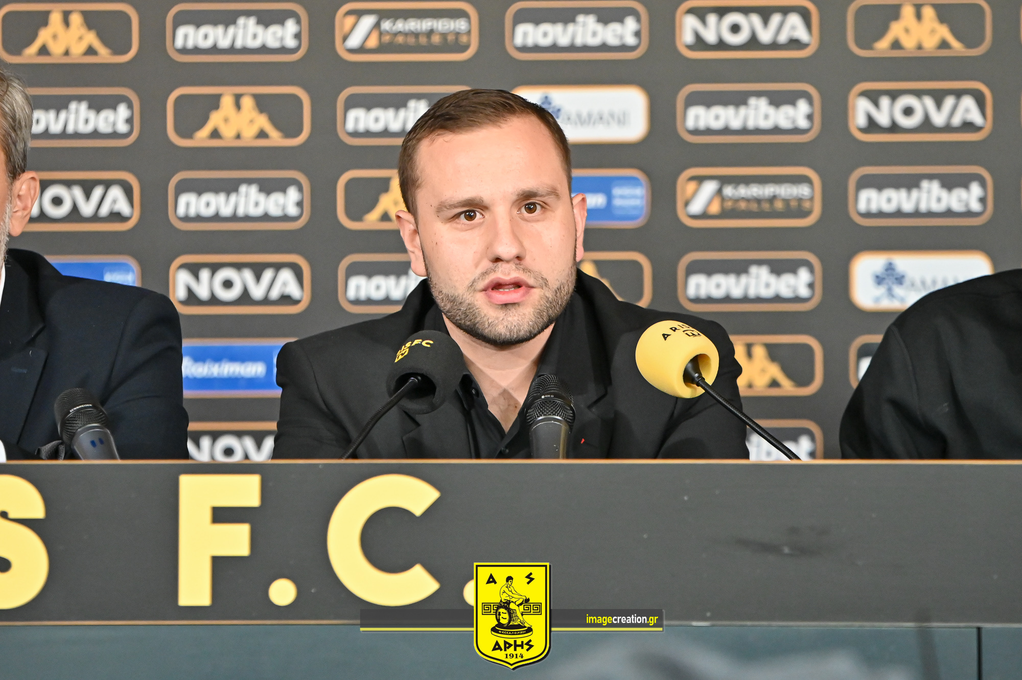 «Ευχαριστώ πάρα πολύ για την παρουσία σας εδώ. Ιδιαιτέρως τους εκπροσώπους από την ΠΑΕ ΑΡΗΣ και τον πρόεδρο της ΚΑΕ, Χάρη Παπαγεωργίου, τους δημοσιογράφους, τα κανάλια και τα ραδιοφωνικούς σταθμούς. Για μένα είναι μία πολύ σημαντική μέρα.